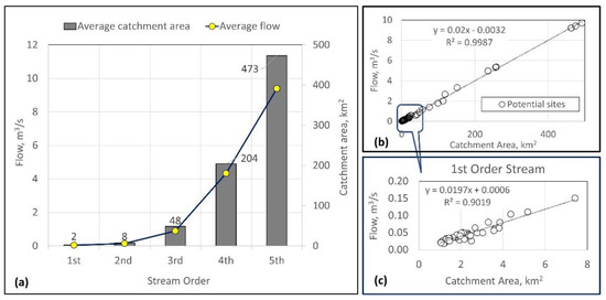 Flow estimates, stream order, and catchment area of the identified sites. (a) Average catchment area and flow by stream order. (b) Flow-catchment area relationship under first-order stream. (c) First stream order potential sites’ flow-catchment area relationship.