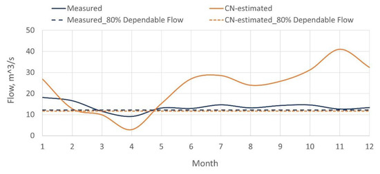 The observed flow data and the estimated runoff using the CN method at the LHEP station, both expressed in mean daily values, are shown in Figure 11. Though both flow datasets show the lowest daily runoff in April, the month with the highest daily flow was November based on CN method estimates. With the actual flow observation, the highest flow was recorded in January. The two runoff curves are showing different patterns: the CN estimated flow shows a more erratic annual pattern with a minimum, maximum and average values of 2 m3/s, 33 m3/s, and 19 m3/s, respectively, while the observed flow at LHEP is smoother with the minimum, maximum, and average flows of 9 m3/s, 18 m3/s, and 14 m3/s, respectively. However, considering the annual 80% dependable flow for a year, the CN flow estimate is lower by 0.56 m3/s.