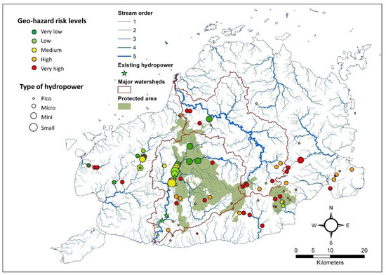 Spatial distribution of potential small-scale hydropower sites identified through topographic analysis, the stream order, corresponding catchment, and the drainage network.