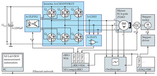 We performed sinusoidal pulsating voltage injection-based measurements to acquire suitable data for the least squares estimation of the unknown machine parameters (16)–(18). The phase voltages and currents were directly measured (see Figure 3). The and voltages and currents were calculated using Clarke’s and Park’s transformations. The measurements were performed at zero speed.