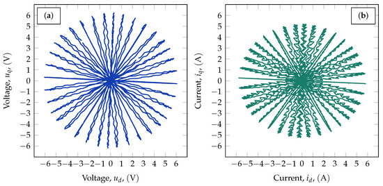 The voltage and current data acquired at electrical rotor position plotted in the coordinate system. (a) Voltage signals. (b) Current signals.