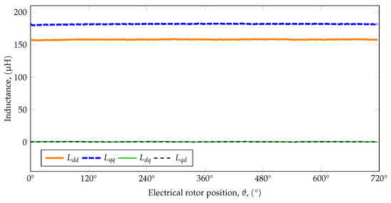 The voltage and current signals acquired at a certain rotor position were concatenated to form the regressor vectors of (16) and (17). The machine parameters were calculated by solving (18). The average value of the phase resistance was . Figure 5 shows the identified inductance values. The inductance values show little rotor position dependence. is higher than . The mutual inductances and are negligibly small. The average values of the self-inductances are