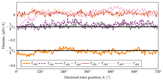 Figure 6 shows the identified values of the elements of the Hessian matrix. Their values are small and significantly noisier than the inductances but they also show little rotor position dependence. Three of the six elements are very small and we set their values to zero.