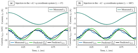 The polarity of the rotor magnets can only be determined based on saliency components that have a significant first spatial harmonic in terms of electrical angle and are spatially aligned with the poles. Such components are produced by magnetic saturation because the axis located at the north pole points into the magnetizing direction and the axis points into the demagnetizing direction. Many papers introduce the injection of short voltage pulses to determine the polarity after identifying the axis [12,25]. Experimental results show that a voltage pulse in the or magnetizing direction has a higher response current than a voltage pulse of the same amplitude and duration in the or demagnetizing direction, due to the non-linear effects of magnetic saturation [26,27,28]. An alternative polarity detection technique uses q-direction injection to induce a small rotor displacement, however, it is suitable only for the application areas, where a slight initial movement of the rotor can be tolerated [22].