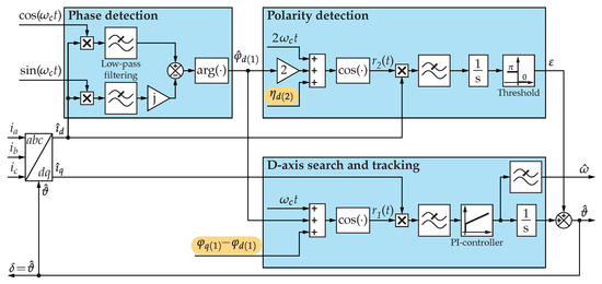 An important part of the sensorless control methods is the zero-speed or initial position detection, which is usually performed over two steps. First, the inductance-based saliency tracker searches for the axis, then another method detects the polarity of the rotor magnets [12,22,23]. Both steps require high-frequency models which are often derived from the corresponding fundamental frequency models [11].