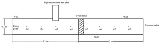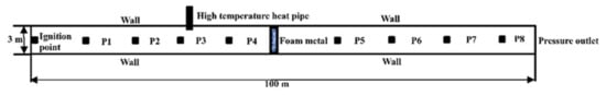 In Section 3.2, the accuracy of the numerical simulation results is verified by comparing the numerical simulation data with the measured data. In order to make the research content more suitable for the actual site, a mine roadway model with length of 100 m and the section of 3 m × 3 m is constructed. The metal foam is installed in the center of the roadway. The high-temperature heat pipe is installed before the metal foam and is 20 m apart from the metal foam. The schematic diagram of roadway model is shown in Figure 5. Distance between monitoring point and ignition point is shown in Table 1. The left side, the upper side, and the lower side of the roadway are all walls. The right side is the pressure outlet. The middle position of the left wall is automatically ignited. The high-temperature heat pipe area is simplified to the convection heat transfer wall. The whole area of the pipeline is filled with methane air premixed gas. The metal foam is set 50 m away from the ignition point, and 8 monitoring points are set up.