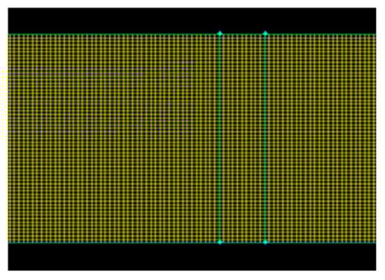 Gambit software is used for grid division. Due to the complexity of the combustion and explosion process of gas air premixed gas, in order to accurately calculate the propagation of flame wave and shock wave in the explosion process, a more detailed grid is used. Considering the calculation accuracy and time, a quadrilateral grid with side length of 5 mm is adopted. The number of generated structural elements is 32,426. The grid division diagram is shown in Figure 2. Wall boundary conditions are used on the upper, lower, and left sides of the model wall. A constant wall temperature of 300 K and a non-slip boundary condition are set up. The empirical convection heat transfer coefficient is set up. The right side of the model is set to the pressure outlet. The metal foam area is set to the porous region. The inertial resistance coefficient, viscous resistance coefficient, specific heat capacity, porosity, density, and other related parameters are set. Let the initial time be t0, the initial temperature T (t0) = 300 K, and the initial pressure P (t0) = 101.325 kPa. The partial velocity in X direction ux (t0) = 0 m/s, and the partial velocity in Y direction vy (t0) = 0 m/s−1. The concentration of methane air mixture in the pipeline is 9.5%, and the mass fraction of various substances in the mixture is .