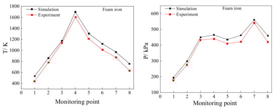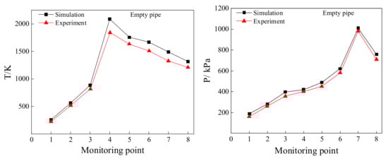 In order to verify the accuracy of the numerical simulation results of gas explosion, the maximum temperature and overpressure at each monitoring point obtained from the numerical simulation are compared with the measured data in literature [22]. Figure 3 and Figure 4 are the comparisons between the numerical simulation results of the gas explosion for empty pipe and the numerical simulation results of the gas explosion with foam iron in the pipe and the experimental results. This can be seen in Figure 3 and Figure 4.