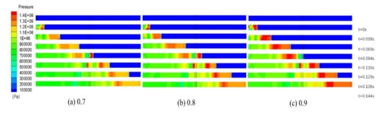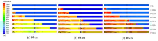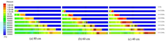 Figure 6 shows the flame temperature cloud map of foam copper with the porosity of 0.7 under the conditions of different thickness. Metal foam has obvious attenuation effect on gas explosion flame wave and can extinguish gas explosion flame. When the explosion flame passes through the porous material, it is divided into several small flames, making the flame front discontinuous and causing resistance to the flame. The collision and friction with the pore wall lead to a sharp reduction in the number of free radicals participating in the combustion reaction and weaken the reaction intensity. The heat exchange effect between the explosion flame and a large number of pore walls and adjacent structures causes a large amount of heat loss of the flame. The temperature of most small flame drops rapidly below the quenching temperature and goes out, to prevent the continuous propagation of flame. When the porous metal foam is placed, the flame wave in the pipeline is attenuated, and the flame temperature growth trend in the pipeline is obviously lower than that in the tube. The greater the thickness, the stronger the fire resistance and the better the attenuation effect of flame wave. When the metal foam material and the porosity are the same, thick metal foam has good effect on temperature attenuation of gas explosion flame, as shown in Figure 6a–c. Figure 7 shows the shock wave overpressure cloud map of foam copper with the porosity of 0.7 under the conditions of different thickness. The effect of porous metal foam on the shock wave attenuation of gas explosion is obvious, and the maximum overpressure attenuation of the pipeline is obvious after the metal foam is laid. The shock wave reaches the surface of porous metal foam; the reflection of the solid surface of the material consumes part of the shock wave energy; and the pores are compressed on the cross section of the pipeline, thus transforming part of the impact energy into plastic energy. The shock wave entering the porous material causes the pore wall of the porous material to become elastically deformed, so part of the impact energy is transformed into elastic energy. In general, the thick metal foam has good pressure drop effect, the pressure drop effect of metal foam with the thickness of 80 cm is better than that with the thickness of 60 cm, and the pressure drop effect of metal foam with the thickness of 60 cm is better than that with the thickness of 40 cm, but the effect of metal foam thickness on overpressure attenuation is not very obvious, as shown in Figure 7a–c.