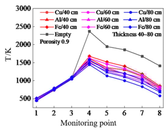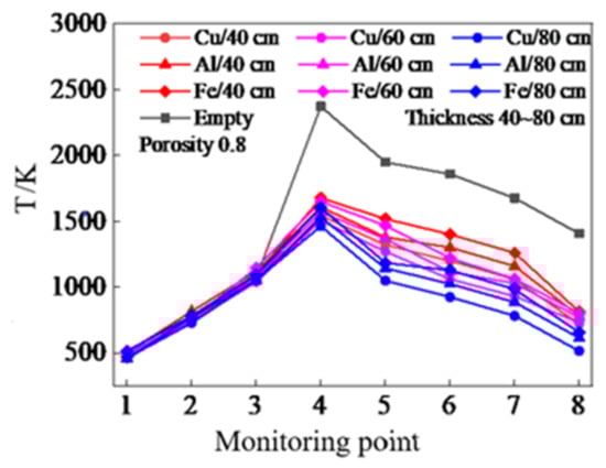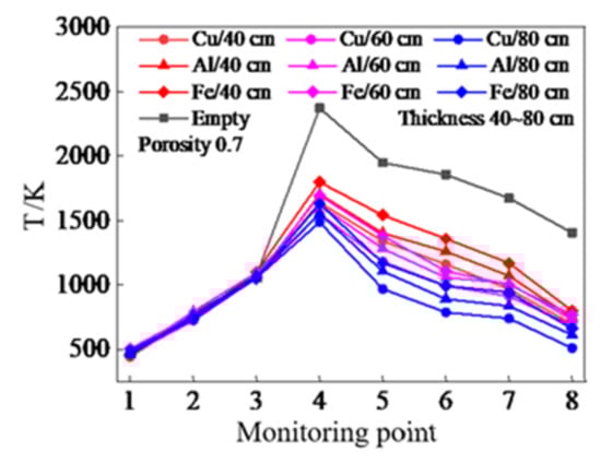 Figure 10 is a curve of flame wave temperature varying under the porosity of 0.9 and thickness of 40–80 cm. It can be seen from Figure 10 that when the base material is copper, the maximum temperature attenuation rate of the metal foam with a thickness of 80 cm is 14.7% higher than that with a thickness of 60 cm, and the metal foam with a thickness of 60 cm is 13.6% higher than that with a thickness of 40 cm. When the base material is aluminum, the maximum temperature attenuation rate of the metal foam with a thickness of 80 cm is 15.5% higher than that of with a thickness of 60 cm, and the maximum temperature attenuation rate of the metal foam with a thickness of 60 cm is 12.1% higher than that with a thickness of 40 cm. When the base material is iron, the maximum temperature attenuation rate of the metal foam with a thickness of 80 cm is 15.8% higher than that of the metal foam with a thickness of 60 cm, and the maximum temperature attenuation rate of the metal foam with a thickness of 60 cm is 12.7% higher than that with a thickness of 40 cm.