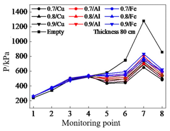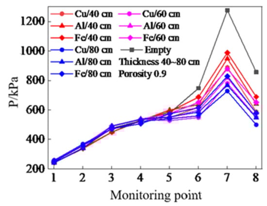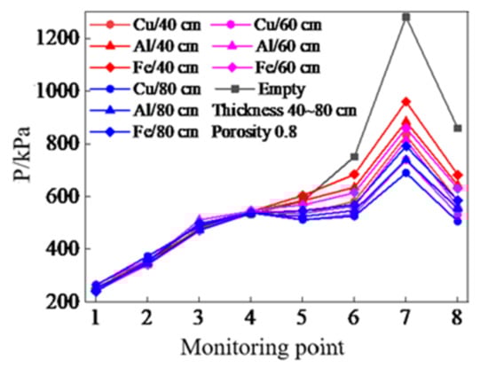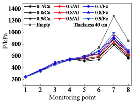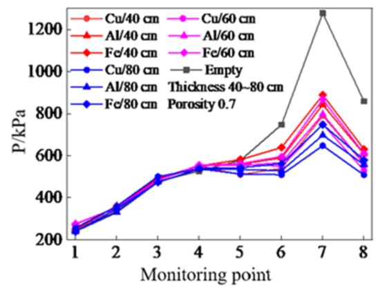 Figure 13 is the overpressure curve of gas explosion in different metal foams under the condition of porosity of 0.8 and thickness of 40–80 cm. It can be seen from Figure 13 that when the base material is copper, the maximum overpressure attenuation rate of metal foam with a thickness of 80 cm is 6.3% higher than that with a thickness of 60 cm, and the maximum overpressure attenuation rate of the metal foam with a thickness of 60 cm is 9.3% higher than that with a thickness of 40 cm. When the base material is aluminum, the maximum overpressure attenuation rate of the metal foam with a thickness of 80 cm is 5.8% higher than that with a thickness of 60 cm, and the maximum overpressure attenuation rate of the metal foam with a thickness of 60 cm is 9.4% higher than that with a thickness of 40 cm. When the base material is iron, the maximum overpressure attenuation rate of metal foam with a thickness of 80 cm is 8.1% higher than that with a thickness of 60 cm, and the maximum overpressure attenuation rate of the metal foam with a thickness of 60 cm is 8.3% higher than that with a thickness of 40 cm.