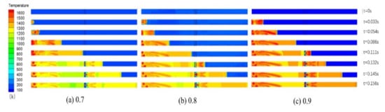 Figure 18 shows the flame wave temperature curves of different metal foams with the thickness of 40 cm and the porosity of 0.7–0.9. It can be seen from Figure 18 that when the base material is copper, the maximum temperature attenuation rate of metal foam with a porosity of 0.7 is 7.6% higher than that with porosity of 0.8, and the maximum temperature attenuation rate of the metal foam with porosity of 0.8 is 6.8% higher than that with porosity of 0.9. When the base material is aluminum, the maximum temperature attenuation rate of the metal foam with a porosity of 0.7 is 7.4% higher than that of the metal foam with a porosity of 0.8, and the maximum temperature attenuation rate of the metal foam with a porosity of 0.8 is 8.1% higher than that with a porosity of 0.9. When the base material is iron, the maximum temperature attenuation rate of metal foam with a porosity of 0.7 is 6.1% higher than that with porosity of 0.8, and the maximum temperature attenuation rate of the metal foam with porosity of 0.8 is 5.8% higher than that with porosity of 0.9.