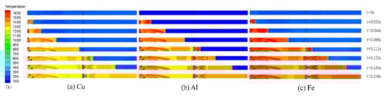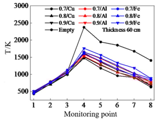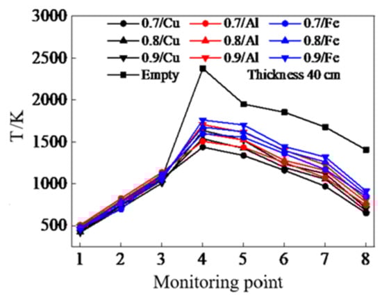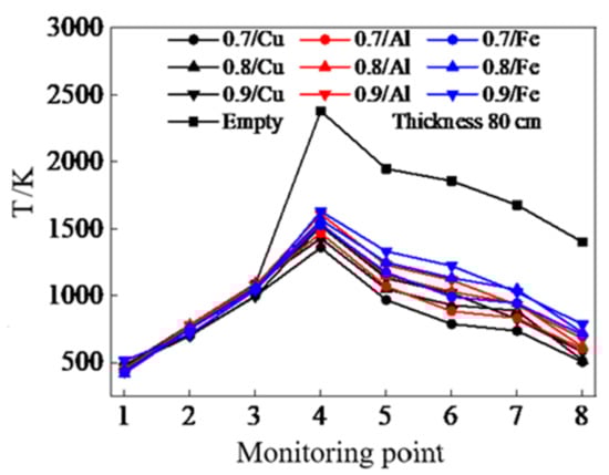 Figure 9 is a curve of flame wave temperature under the porosity of 0.8 and thickness of 40–80 cm. It can be seen from Figure 9 that when the base material is copper, the maximum temperature attenuation rate with a thickness of 80 cm is 17.3% higher than that with the thickness of 60 cm, and the maximum temperature attenuation rate with a thickness of 60 cm is 16.8% higher than that with a thickness of 40 cm. When the base material is aluminum, the maximum temperature attenuation rate with a thickness of 80 cm is 16.4% higher than that with the thickness of 60 cm, and the maximum temperature attenuation rate with a thickness of 60 cm is 15.1% higher than that with a thickness of 40 cm. When the base material is iron, the maximum temperature attenuation rate with a thickness of 80 cm is 16.9% higher than that with the thickness of 60 cm, and the maximum temperature attenuation rate with a thickness of 60 cm is 14.3% higher than that with a thickness of 40 cm.
