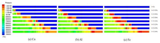 Figure 16 shows the flame temperature cloud map with thickness of 40 cm and porosity of 0.8 under the conditions of different materials. Figure 17 shows the shock wave pressure cloud map with thickness of 40 cm and porosity of 0.8, under the conditions of different materials, as shown in Figure 16 and Figure 17.