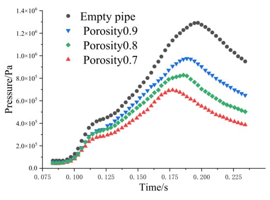 The curves of pressure versus time for empty pipe and the pipe with 80 cm copper foam for different porosities installed.