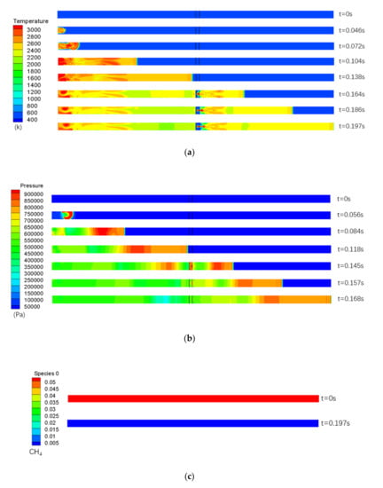 Numerical simulation results. (a) Flame propagation process; (b) shock wave propagation; and (c) methane reaction process.