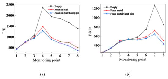 In the pressure figures (Figure 11, Figure 12 and Figure 13), the overall pressure reaches its maximum at monitoring point 7. Theoretically, the larger the thickness of the metal foam is, the stronger the heat conduction and quenching ability is. However, in a practical sense, the metal foam is also an obstacle when it is installed in the roadway. The existence of obstacles promotes the formation of the explosion turbulence, thus aggravating the intensity of the gas explosion. In case of gas explosion in the pipeline, the maximum pressure of each monitoring point gradually increases with the increase of distance, but due to the existence of the opening on the right side, the maximum temperature gradually decreases from monitoring point 4 and the maximum pressure decreases from monitoring point 7.