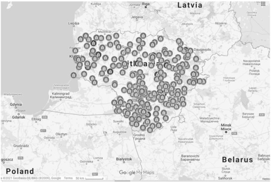 Distribution of farmers who offered their products via the network “Village to Your Home” in Lithuania in December 2021 [34].