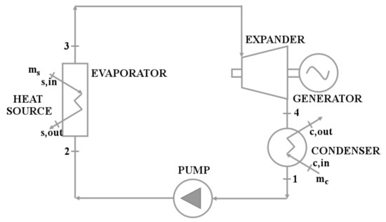 The ORC system was investigated in a simple and sub-critical configuration, without any regeneration process, since it was widely demonstrated both in literature and by the market that this is the most effective configuration for low grade heat recovery applications (Figure 1 and Figure 2) [43,44].