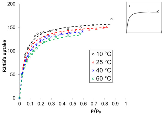 Then, for a number of values of R245fa molar uptake, the enthalpy of desorption was determined by means of the Equation (5), resulting in an average value of about 8.7 kcal/mol.