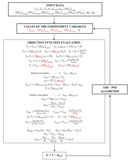 The optimization variables in the procedure (independent variables in Figure 5), were the evaporation pressure , the pinch point temperature differences () in both the heat exchangers, the approach point in the HTHE and the MIL101 mass fraction . Whereas the approach point at the condenser was fixed equal to 25 °C and was included in the optimization procedure together with other input data, listed in Figure 5.
