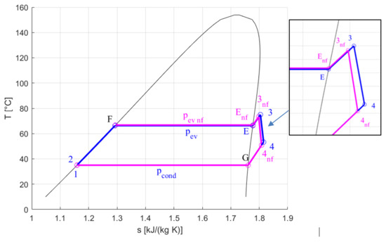- Since the specific heat affects the isobar shape in the T-s diagram, the previous assumption (Equation (8)) also allows to consider, for the nanofluid operating points, the same isobars of the pure R245fa fluid during the heat exchanges in the HTHE and in the LTHE.