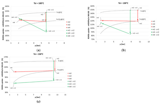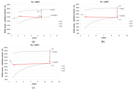 Equations (8) and (9) clearly show the significant influence of the R245fa mass uptake on the benefits provided by the nanoparticle suspension. If the mass uptake is smaller than the mass of MIL101 suspended nanoparticles, the term in Equations (8) and (9) is negative, reducing or even annulling the benefits related to the nanoparticle suspension (second and third terms in Equations (8) and (9). But the R245fa mass uptake depends on the operating conditions of the cycle (pressure and temperature values), clearly confirming the need of the optimal tuning of the operating conditions for the nanofluid adoption, as demonstrated in the preliminary analyses [41,42].