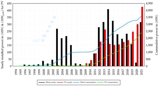 Installation of Wind and PV over the past decades in Austria. Adapted from data of [1,2].