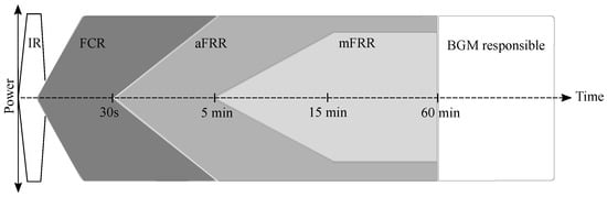 Figure 4 shows the control energy types concerning their activation periods. Primary control must be activated within the shortest possible time and guarantee the entire power supply or consumption within a time frame of 30 s. Secondary control follows on from primary control and must assure full power supply or consumption in a time frame between 30 s and 5 min. After 5 min, the minute reserve is activated, which has up to 15 min to provide full power supply or consumption. After 60 min, the balancing group manager regulates the electrical grid.