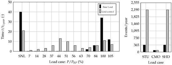 - In base-load electricity production, the machine runs predominantly at its optimum. Therefore, the number of starts and stops of the machine set per day is also lower. In Figure 5, the number of starts and stops per day was set to one, which means that the machine set is started up once a day and remains at the optimum operating point. If the power demand from the grid is deficient, the machine set is left in a synchronized state (SNL) and rotates in “idle mode” in order to be quickly brought back to the optimum and to be able to deliver power when needed.