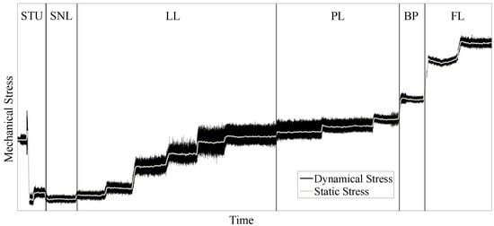 The complexity of this task becomes obvious when looking at the stress-versus-time correlation (see Figure 6) of a Francis runner at all load steps. Stress was taken from a strain gauge measurement mounted at the trailing edge close to the crown at the suction side of the blade. The observation starts from the machine set start-up (STU), until synchronization, followed by the speed–no-load (SNL) area. Next in line is the low-load (LL) area attached to the part-load (PL) region heading up at the best-point (BP) area. Afterwards, the machine set operates at full-load (FL) conditions.