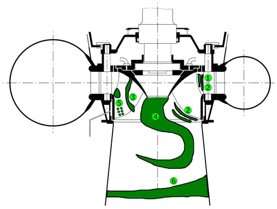 To visualize the above-mentioned flow patterns according to their position within the turbine system, one can use Figure 7 by using the following nomenclature: ➀ rotor–stator interaction (RSI), ➁ vortex Shedding (VOS), ➂ inter-blade cavitation vortex (ICV), ➃ draft-tube-vortex (DTV), ➄ stochastic-pressure pulsations, cavitation (SPP) and ➅ free-surface oscillation (FSO).