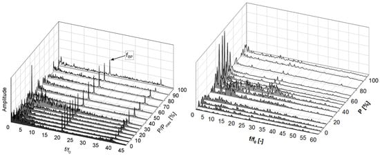 Figure 9 shows the comparison of two frequency spectrum waterfall plots (normalized frequency spectrum versus normalized power) for strain gauge applications at the same runner location with different specific speeds of the runner. The runner on the left-hand side has a specific speed of min and the one on the right hand side has min. The most obvious difference is the frequency peak of the normalized gate-passing frequency , which is for the left runner and for the right runner. However, this signal’s amplitude is much more pronounced on the left runner, while on the right, it is only slightly visible at the optimum load point [31]. This is probably because the rotor–stator interaction with an of min is much stronger than that of a runner with min. Ref. [36] came to the same findings. The vaneless space has a significant influence, here. However, it has to be mentioned that the strain gauges, having been mounted on the impeller exit side, and can, therefore, only weakly resolve the leading edge phenomenon, as it is very far away from the trailing edge.