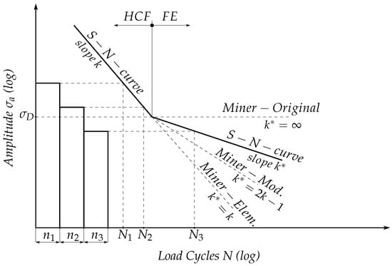 - Haibach, E. Betriebsfestigkeit, 3rd ed.; Springer: Berlin/Heidelberg, Germany, 2006. [Google Scholar]