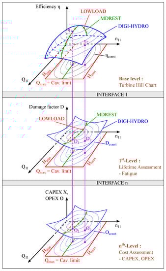 Closing this gap at the interface requires a multi-level approach. The starting point is the turbine hill chart. This map reflects the possible operational limits of the hydraulic machine. On the one hand, the minimum and maximum net head limit the operating range. The flow through the turbine is restricted at the lower end by the cavitation limit and at the upper end by the maximum discharge capacity of the machine. Many operators restrict the operation below the cavitation limit by only passing through this area at machine start-up. Permanent operational use of this deep, partial-load area is suspended for mechanical reasons. Recently, however, the requirements of the load dispatcher (TSO, DSO) for grid regulation can lead to an opening of this operating range. It seems clear that this unfavorable operation reduces the component lifetime. The scientific challenge is to permanently determine the remaining service life of hydraulic machines as a function of the current machine operation. Digitalisation can help in this case to provide the needed data, data handling and data visualisation. Critical points are the amount of data due to higher sampling rates at the machine level and harmonization issues in terms of low data amount at the system level side. Providing the remaining lifetime continually needs a permanent correlation between operating hours, machine load and component damage.