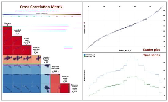 Figure 5 shows the different operating times of one typical machine set in one year (basic data have been provided by the operator and standardized for one year of operation). It becomes apparent that the hydraulic machine set is increasingly operated in the partial load range (25–60% of the design point) for grid service operation. In other words, volatile fluctuations in the grid are compensated by a variable, additive share from hydropower. Looking at the decades of operation in base load mode, it is noticeable that the machine set is driven directly into the design point range from the start and remains there. Most of the time, the machine is operated at full power output to generate the electricity market’s corresponding income.