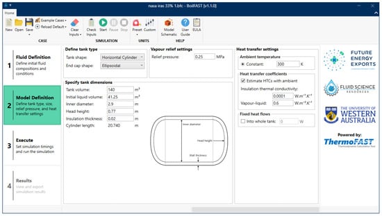 The freely available software package BoilFAST (UWA Fluid Sciences and Resources Division, Perth, Australia) [] contains an implementation of the extended SHV model within a Dynamic Link Library (DLL) that is accessed via a Graphical User Interface (GUI) in a Windows environment. This allows the user to easily set up a simulation, selecting from a range of tank geometries, thermodynamic models, boundary conditions, and compositions, and run the simulation using the SHV model, as well as view or export the results. An image of the BoilFAST GUI is shown in Figure 1. The GUI allows the user to simulate boil-off for many industrially important fluids including LH2. To this end, a range of fluid components can be selected in the GUI, including both spin isomers of hydrogen and equilibrium and normal hydrogen. The latter is included to facilitate future comparisons of BOG generation in systems that have been cooled too rapidly and have not equilibrated the spin isomer ratio.