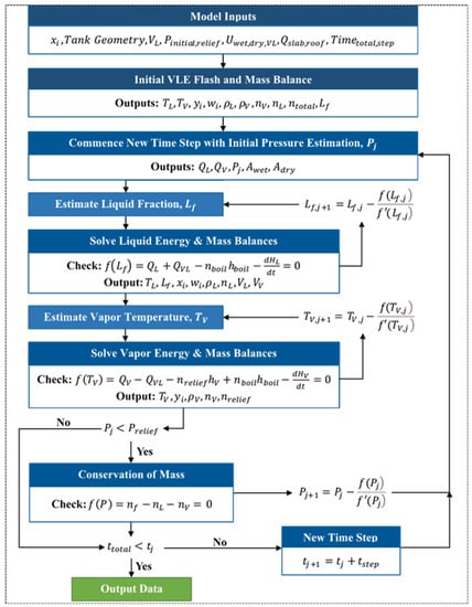 Assuming a saturated liquid temperature, TL, the liquid energy balance (Equation (6)) iterates until convergence by applying a root-finding algorithm, as shown in Figure 3. This yields the liquid fraction, Lf, which in turn gives the amount of liquid, nL. By solving the liquid energy and mass balances, the volumes of liquid and vapor, liquid (xi) and boil-off (wi) composition, and the amount of vapor leaving the liquid (nboil), Equation (9) during one timestep can be found. To find the vapor temperature, the vapor energy balance is iteratively solved (Equation (7)). During this process, the amount of vapor relieved, nrelief, vapor composition (yi), and the thermodynamic properties of the vapor phase are also found. The vapor temperature is taken to be the average temperature for the vapor phase.
