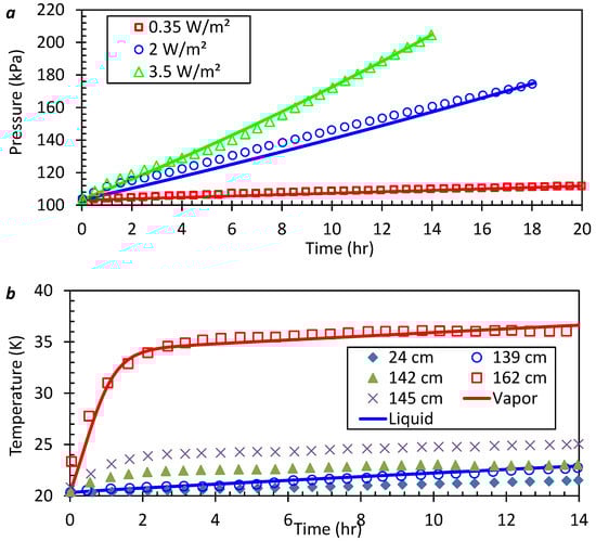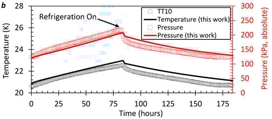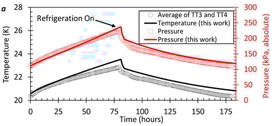 Overall, the BoilFAST calculations are in good agreement with the experimental data for both the 33% (Figure 4a) and 67% (Figure 4b) fill experiments. The model represents the pressurization and subsequent depressurization for both experiments, well only slightly deviating in the pressurization rate during the initial heat leak and at the activation of the IRAS. The temperatures measured closest to the vapor–liquid interface in each case are compared with the model calculations. In Figure 4a, sensors TT3 and TT4 were located several centimetres below and above the vapour–liquid interface, respectively [], with the average of their readings taken to be the best experimental representation of the interface’s temperature. This estimate of the interface temperature is in good agreement with the model’s estimation of the dynamic liquid temperature during refrigeration, noting that the model represents the liquid as a homogenous saturated fluid with a temperature set by the tank pressure (i.e., a uniform liquid with the interface’s temperature). For Figure 4b, sensor TT10, located at the 61% fill level [], was closest to the vapor–liquid interface (approximately 13 cm below); the measured temperature was lower than that estimated because the liquid also thermally stratified as discussed by Notardonato et al. []. The liquid temperature estimated by the model is the saturation value corresponding to the tank pressure, which will always be higher than temperatures measured by sensors immersed in the bulk liquid phase (below the interface) due to stratification. The SHV model currently implemented in BoilFAST assumes the liquid phase is saturated and thermally homogenous. Nevertheless, the agreement between the current model and the experimental data at two different filling levels is encouraging, particularly given the application of refrigeration, which could be modelled in BoilFAST by using an ambient temperature of 20 K (below that of the tank contents).