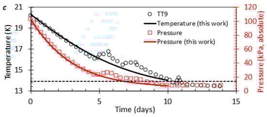 Additionally, BoilFAST was used to simulate experiments investigating the densification of stored LH2 by cooling below the triple point (13.8033 K []) conducted using the IRAS system []. The first densification experiment involved 57.5 m3 of LH2 at atmospheric pressure (46% full) and was subjected to refrigeration for 14 days total, reaching the triple point after roughly 10 days. BoilFAST was used to simulate the period of IRAS refrigeration until the triple point was reached; a comparison of the model’s results with the experimental data is shown in Figure 4c. The liquid temperature estimation closely aligns with the experimental results, except for an irregularity in the data occurring in the range of 125 to 250 h, which was caused by temporary issues with the refrigeration system. The resultant pressure decline in the tank is also well represented, with the same deviation observed in the middle of the experiment. This capability of the model to simulate storage at sub-atmospheric pressures is highly relevant to LH2 applications in microgravity environments, including the cryogenic storage systems needed for future long-term space missions [].