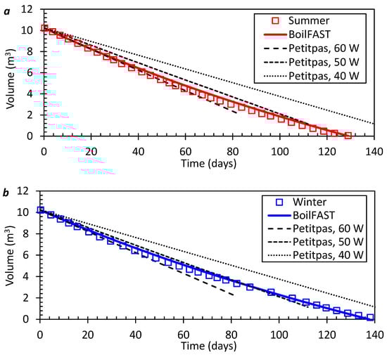 Changes in liquid volume in the 12.5 m3 Dewar tank during (a) summer and (b) winter. Symbols correspond to the published experimental data while dotted and solid lines correspond to model calculations from the work of Petitpas and BoilFAST, respectively.