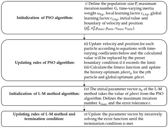 Many algorithms were adopted for the identification of model parameters, which in general can be divided into gradient-free methods (i.e., PSO algorithm) and gradient methods (i.e., L-M method). The fitting accuracy of the PSO algorithm is often inferior to that of the L-M method, while the initial value of the L-M method is crucial to determine will fall into a local optimum [43]. Therefore, in this case, we first used the PSO algorithm for the prediction of the model parameters and used the identification results as the initial values of the L-M method to establish a joint algorithm for the accurate estimation of the parameters in LDM.