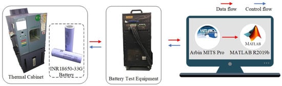 A Samsung INR18650-33 G battery (Cell Business Division, Samsung SDI Co., Ltd., Yongin, Korea) with nominal capacity 2700 mAh (0.2C, 2.50 V discharge), nominal voltage 3.6 V, charging end voltage 4.1 V, and discharge cut-off voltage 2.5 V, was adopted as the sample battery. An Arbin BT-5HC (Arbin Instruments, LLC, College Station, TX, USA) with voltage range 0–5 V DC, and maximum current ±30 A was adopted for calibration, driving schedule simulation, and temperature monitoring. A Sanwood SC-80-CC-2 (Sanwood, Dongguan, China) thermal cabinet provided a controlled temperature and humidity environment during experiments. Arbin Mits Pro Software (v7 PV.202103) and MATLAB R2019b (MathWorks, Natick, MA, USA) were adopted for driving schedule file editing and application, data logging, model establishing, and data processing [47,48]. The configuration of the offline test bench is shown in Figure 2.
