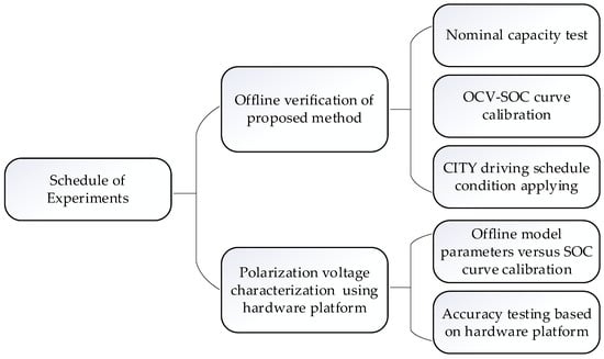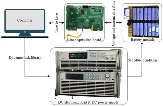 In addition, to test the online application performance of the proposed method, a hardware platform for real-time quantitative characterization on polarization voltage of lithium-ion batteries was built, as shown in Figure 3. A Chroma DC electronic load 63206E and programmable DC power supply 62050H (Chroma Electronics (Shenzhen) Co., Ltd., Shenzhen, China) were adopted for schedule condition application. A battery fixture (homemade) was used to hold battery cells and connect the circuit. Batteries were connected in series in this case. A data acquisition board (homemade) was used to acquire current and voltage signals, where the sampling frequency was 1 Hz. MATLAB R2019b (MathWorks, Natick, MA, USA) was adopted for driving schedule file editing and application, data communication, logging, and data processing.
