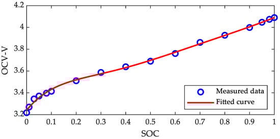 The SOC-OCV curve was obtained by a series of discharge pulses with different spacing to calibrate a series of points and then fit. The specific steps were: (1) use the CC-CV method to fully charge the battery, and rest for 2 h, record the end voltage as the open-circuit voltage (OCV) of the battery at 100% SOC; (2) discharge the battery to 98% SOC using a constant current rate of 0.2 C and rest for two hours, and record the end voltage as the open-circuit voltage at SOC level of 98%; (3) repeat step (2) and measure the open-circuit voltage of SOC at levels 95%, 90%, 80%, 70%, 60%, 50%, 40%, 30%, 20%, 10%, 8%, 5%, 3%, 1% and 0%. The SOC-OCV points obtained at different SOC levels were recorded and the relationship between OCV and SOC was described using a sixth-order polynomial. And the recorded result is shown in Table 1 and the recorded data points and fitted curve are shown in Figure 5.