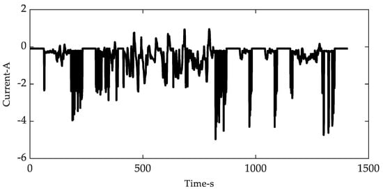A CITY driving cycle was applied to the battery at an ambient temperature of 25 °C to obtain realistic battery cycle data to verify that the model could accurately describe the battery behavior or not. Part of the battery cycle data was intercepted as input data for the improved PSO algorithm, L-M method, and the joint algorithm, respectively. In this case, was used as the starting point, and 1408 subsequent data points (i.e., one CITY cycle) were intercepted. The current curve is shown in Figure 6 as the input data for the parameter identification algorithm. The test data were fed into those three algorithms separately, and the identification results of the three model parameters were obtained, as shown in Table 2.