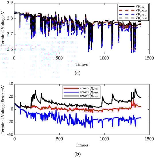 Comparison of LDM output voltage curve based on three types of parameter identification algorithm during the CITY test at 25 °C ambient temperature. (a) Voltage curve; (b)voltage error curve.