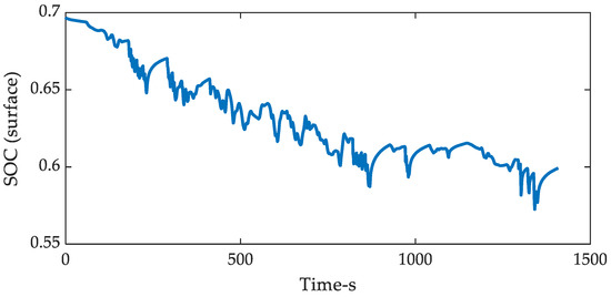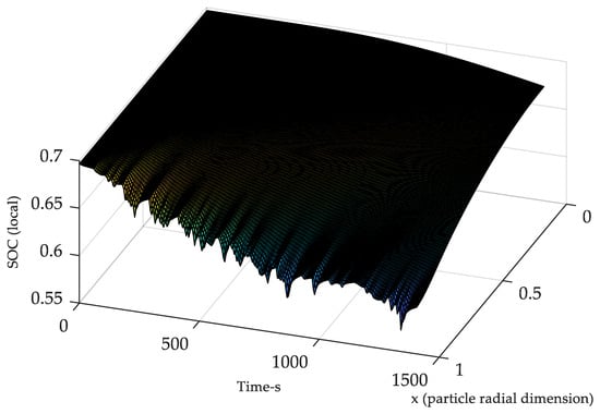After solving the partial differential equation in LDM, the distribution of the local SOC inside the electrode particle can be obtained, as shown in Figure 9. At the particle size dimension taken as X = 1, the distribution of SOC on the electrode particle surface with time is obtained, as shown in Figure 10. Based on LDM, the variation curves of activation polarization voltage, ohmic polarization voltage, and concentration polarization voltage with time can be obtained, respectively, as shown in Figure 11. A conclusion can be drawn that the activation polarization and ohmic polarization respond quickly to the change of input current excitation; compared with the other two, and the concentration polarization responds more slowly to the change of input current excitation. When a non-zero current was applied to the cell system, a gradient in the concentration of the active material in the solid and liquid phases was gradually formed, and the voltage drop from concentration polarization gradually increased, while the time constant of this process was much larger than that of the ohmic and activation polarization. This conclusion is consistent with that obtained in [5] using the Pseudo-2D model under EUCAR driving conditions. The superposition of these three types of polarization phenomena is reflected in the output terminal voltage of LDM, which determines whether the proposed method can accurately describe the cell behavior. The results of the terminal-voltage accuracy comparison above justify the proposed method.