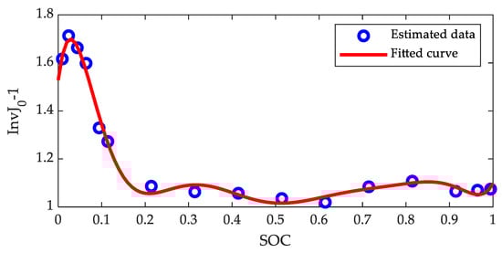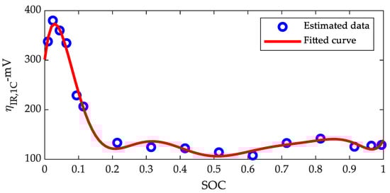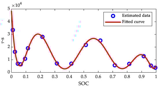 To realize the online quantitative characterization of the polarization voltage drop based on LDM, the model parameters at different SOC levels need to be identified offline in advance. Discharge pulses were applied to the battery at 25 °C at different SOC levels and rest for 2 h after each discharge pulse, and current versus voltage data were recorded throughout. The SOC levels were selected as 98%, 95%, 90%, 80%, 70%, 60%, 50%, 40%, 30%, 20%, 10%, 8%, 5%, 3%, 1% and 0%. A portion of the data before and after each discharge pulse, containing the zero-state response and zero-input response phases, was intercepted as input data for the parameter identification algorithm. A 9th order polynomial was used to fit the parameter points. The fitting curves for three model parameters are shown in Figure 12, Figure 13 and Figure 14.