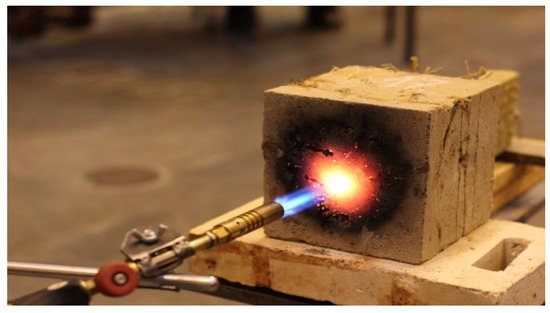 A purpose of testing was the simulation of straw samples’ resistance to fire determined in time, depending on the direction of stalk orientation (parallel and perpendicular) to the heat flow direction in the worst fire conditions possible and checking how the material tested would behave. The test consisted of exposure of samples made of straw (P1a ÷ P10a), light clay (P11 ÷ P15), and solid clay mortar (P16 ÷ P20) to fire by means of the torch with a maximum flame temperature above 1000 °C at a 10.0 cm distance (Figure 4).